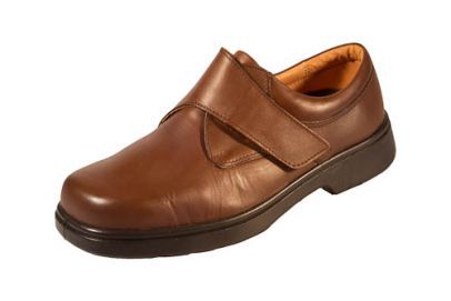 Easy access leather shoe with the convenience of a secure Velcro strap. With a wide and deep toe box this style can easy fit a swollen foot up to size 12.